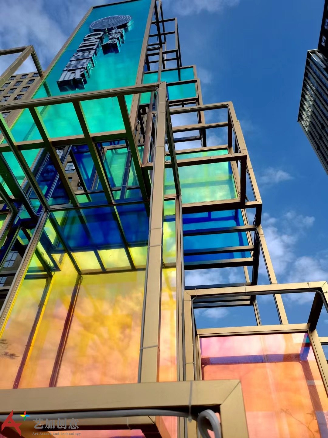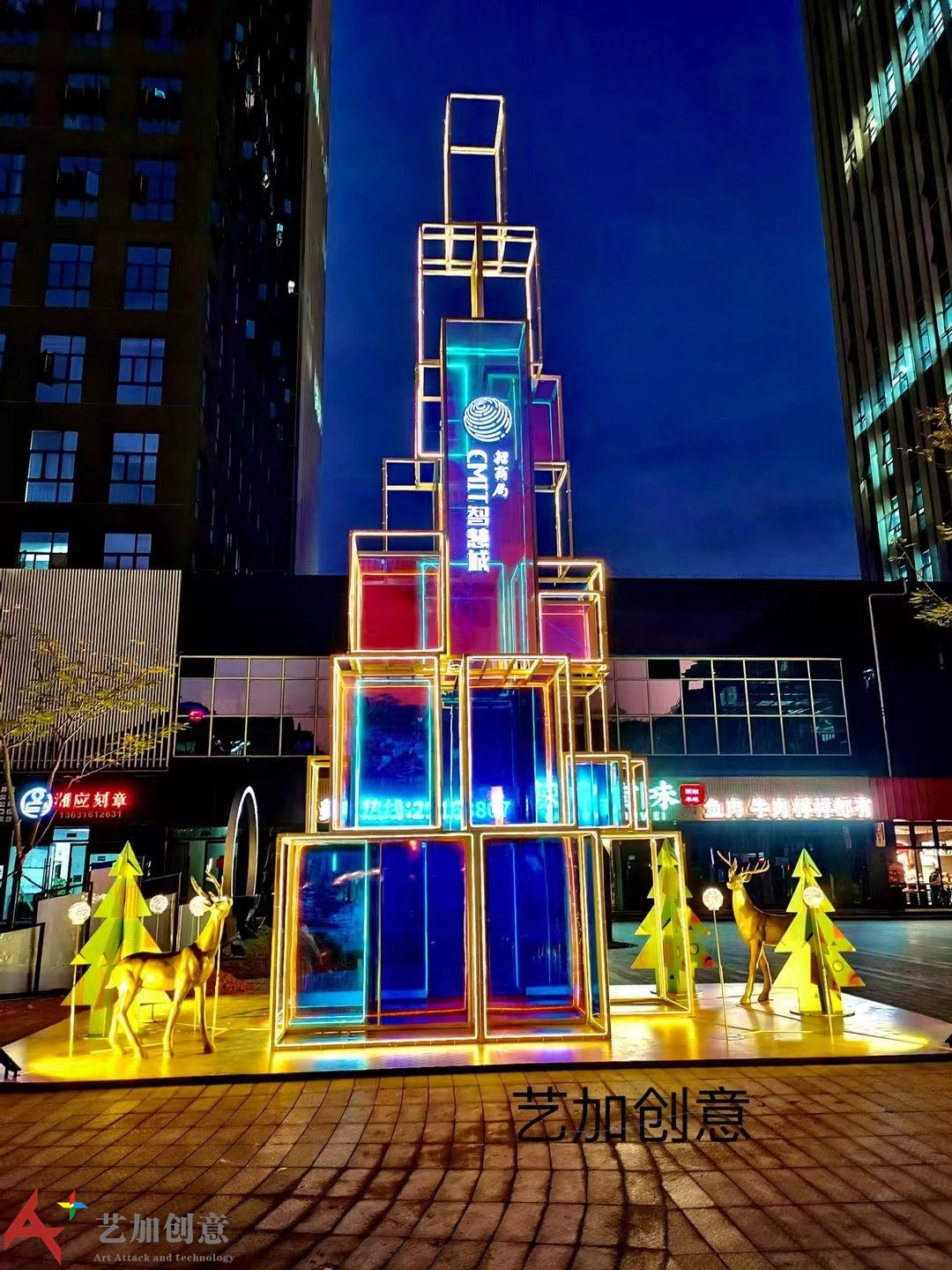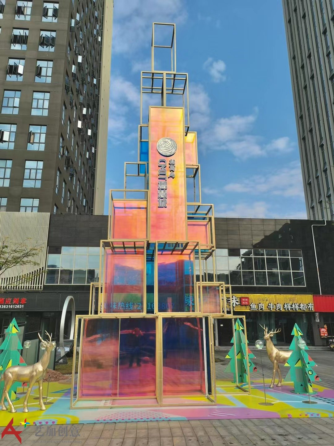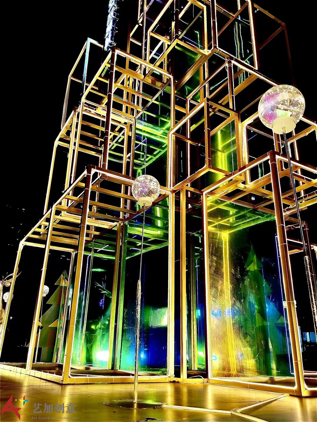美陈案例炫彩膜圣诞树亮化美陈造型是艺加创意 2021年为 制作的商业外场美陈,创意雕塑。
